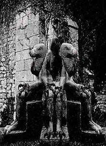 Se trataba de figuras esculpidas en piedra negra, que medían más de tres metros de altura. Cada una de ellas tenía tres cuerpos unidos, coronados por tres cabezas que miraban adentro, afuera, y al portal. Las caras eran de buitre, y las manos que apoyaban sobre las rodillas eran como garras.