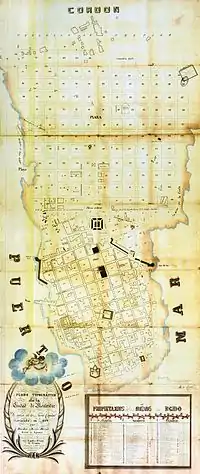 El encargue hecho a José María Reyes en 1829, se transforma pues en trazado definitivo, dibujado en 1836 por Juan Manuel Besnes e Irigoyen (cuyo original se conserva en la Biblioteca Nacional). En líneas generales, este primer ensanche del casco colonial, corresponde en la ciudad contemporánea al barrio Centro. (p. 19)[3]