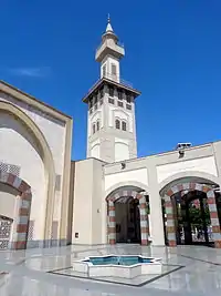 La altura de toda la edificación no supera los dos pisos de altura, con excepción de los dos minaretes, las torres gemelas que se destacan en el predio. Para acceder hasta sus ventanas superiores hay que trepar 160 escalones, los últimos 13 en una especie de escalera marinera, completamente vertical. Todo el complejo está despojado de adornos, y las paredes están pintadas de un color crema. La edificación, con ventanales característicos de la arquitectura árabe, descansa sobre espaciosos jardines, verde inglés, adornados con palmeras.[4]