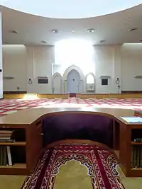 El área de culto en sí, o sea, la mezquita, tiene una superficie de 2000 m² totalmente tapizada por una enorme alfombra, en tonos mostaza y bordó, bien mullida y especialmente confeccionada en tierras del rey Fahd, que tapiza toda su superficie. Su capacidad está estimada para mil fieles y el único elemento ornamental que se destaca en la muy austera decoración es una vistosa araña de cristal, con 230 bombitas, de 3 metros de diámetro por 3 de altura, que pende del centro de su cúpula. Cerca de la entrada posee además baños donde los creyentes y visitantes podrán lavar sus pies antes de descalzarse obligatoriamente antes de ingresar al templo, dejando sus zapatos en unas estanterías de madera construidas al efecto.[4]