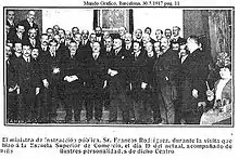 - «Ayer [29.1.1882] a las cuatro de la tarde se celebró en el Círculo de la Unión Mercantil la inauguración del Centro de Instrucción comercial. Presidia el señor Antonio Ros de Olano Ministro de Fomento, que tenía a su derecha al rector de la Universidad, Sr. Pisa Pajares, al director de la Escuela de Comercio, Sr. Márquez, y al Secretario del Centro, Sr. Rodríguez, y a su izquierda al presidente de la Sociedad Sig. Gil y a los Secretarios, Sres. Bona y Ferrer. El espacioso salón principal del Círculo estaba literalmente atestado de público. Abierta la sesión, el Sr. Bona leyó una Memoria, consignando en breves líneas los trabajos realizados por la junta directiva para conseguir la constitución del Centro, y dando las gracias al señor Ministro de Fomento por presidir la sesión inaugural, y a los Sres. Ruiz de Velasco, Fabra y Floreta, Urquijo, Santibáñez, Peña Villarejo y otros señores comerciantes, por lo que han contribuido a este fin. Siguieron en el uso de la palabra el secretario de la Sociedad, Sr. Rodríguez, para saludar y agradecer también al señor Ministro de Fomento su deferencia por la honra que dispensaba al Centro presidiendo su inauguración, y para animar en entusiastas frases a los que se dedican a la carrera comercial. El Sr. Martínez en nombre de la Junta directiva muestra el júbilo de que se siente poseído por ver realizado en los hechos. El Sr. Fernández y González manifiesta que tiene que cumplir dos cargos, en nombre de los hijos del trabajo: el primero saludar a sus hermanos los individuos del Centro de instrucción comercial, y el segundo, dar un público testimonio al señor Ministro de Fomento, de la gratitud que le deben las clases obreras y comerciales por el interés que toma en su ilustración.