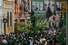 Desde el período colonial, la presencia de poblaciones negras es algo que está fuertemente arraigado en la cultura del Centro Histórico, al fin y al cabo, la familia patriarcal no estaba solo constituida por lazos hereditarios y matrimonios, incluía, por ejemplo, a los esclavos domésticos afrodescendientes, que traían junto sus creencias y culturas. Un ejemplo de esta influencia es el que acreditan ser el primer terreiro candomblé del pueblo Ketu en Bahía, y que se encuentra en el actual Espaço Cultural da Barroquinha en el Centro Histórico. En el siglo XIX, el terreiro fue retirado del local y originó otros tres en Salvador, que están entre los nueve terreiros enumerados por el IPHAN (siete de ellos se encuentran en Salvador):[18] Terreiro da Casa Branca, Terreiro do Gantois e Ilê Axé Opô Afonjá.[19] Estos sitios contribuyen, principalmente, para el mantenimiento de la memoria del local y para la continuación de las prácticas religiosas de las poblaciones de la región, aunque puedan ser utilizados con propósitos turísticos y de carácter étnico o religioso. Además, a lo largo del siglo XX se crearon, tanto en Salvador y como en el Centro Histórico, grupos, bloques carnavalescos e instituciones que buscan reforzar la identidad afrobrasileña y la fuerza de los movimientos negros en la actual sociedad de Brasil. Entre ellos están: Afoxé Filhos de Gandhy, un homenaje al líder indiano; el Grupo Cultural Olodum (enlace a la página Wikipedia); Casa do Benin; y Casa da Angola.[20]