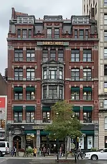 A nivel del suelo, la entrada principal se encuentra en el lado izquierdo (oeste) de la fachada, que conduce a las escaleras a los pisos superiores. Los pilares revestidos de piedra con capiteles decorados dividen la fachada a nivel del suelo en tres secciones principales, que a su vez se subdividen en varias secciones más pequeñas. Entre los dos pilares centrales se encuentra la entrada de Barnes & Noble, con dos conjuntos de tres puertas dobles. El resto de la fachada tiene ventanas de altura completa con marcos de hierro. Las aberturas de las ventanas del sótano han sido selladas y cubiertas con rejas de hierro. Inmediatamente por encima de la planta baja, la fachada tiene molduras de terracota y piedra, y encima de eso, ladrillo rojo. Una cornisa se encuentra por encima del nivel del suelo.[27]