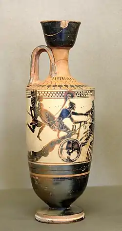 En la década del 630 a. C. aparecieron los primeros pintores áticos que utilizaron las figuras negras para el conjunto de los vasos cerámicos. Época de la que ya se conocen los nombres de los artistas más destacados, como Nicóstenes o Exequias, ambos grandes virtuosos del trazo. La temática está dominada por la mitología épica, pero aumenta la representación de atletas, banquetes, escenas galantes, bodas, enterramientos y escenas de la vida cotidiana.[11]