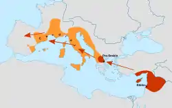 Se ha inferido que la difusión de la cerámica cardial solo es posible gracias a las grandes dotes de navegación de sus pueblos, ya que entre los restos bromatológicos aparecen especies propias de mar adentro; y que a través de la navegación se extendieron por gran parte del Mediterráneo. El caso es que cruzan el Adriático colonizando Apulia y Sicilia en el sur de Italia, instalando sus zonas de habitación casi siempre en cuevas (aunque hay algunos poblados fortificados con fosos y empalizadas). Gradualmente, la colonización alcanza el centro de Italia (Lacio, Toscana, Liguria) y las islas, como Córcega y Cerdeña, apareciendo las primeras avanzadillas en el sur de Francia.