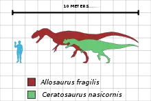 Ceratosaurus (gr. "reptil con cuerno") es un género extinto con tres especies de dinosaurio terópodo ceratosáurido, que vivió a finales del período Jurásico, hace aproximadamente 153 y 148 millones de años, en el Kimmeridgiense y el Titoniense,[lower-alpha 1] en lo que hoy es Norteamérica, África, Uruguay y Europa. La especie tipo, Ceratosaurus nasicornis es conocida principalmente por cinco esqueletos fragmentarios incluidos los cráneos los cuales han sido hallados en la Formación Morrison, en el oeste de los Estados Unidos. Ceratosaurus fue uno de los primeros dinosaurios descubiertos y el cuarto terópodo en descubrirse, por lo cual fue algo difícil su clasificación, por esto fue el miembro tipo del infraorden Ceratosauria el cual lleva su nombre. También se han hallado fósiles asignados a la especie Ceratosaurus nasicornis, en la Formación Lourinhã en Portugal[1] y posiblemente en la Formación Tendaguru en Tanzania.[2][lower-alpha 2] Dos especies, de las muchas que alguna vez se han nombrado, todavía son consideradas dudosas, Ceratosaurus roechlingi de Tanzania y Ceratosaurus meriani de Suiza