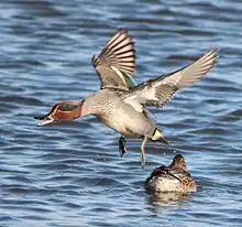 La cerceta común (Anas crecca)[2][3] es una especie de ave anseriforme de la familia Anatidae que habita en Eurasia y África. Es un pato migratorio que cría en el norte de Eurasia y pasa el invierno en el sur de este continente y África. Es una especie bastante común, y a menudo muy numerosa, y se trata de uno de los patos de superficie más pequeños. Presenta dimorfismo sexual, mostrando el macho un plumaje llamativo, característico por su resaltado «antifaz» verde azulado, siendo mucho más vistoso que la hembra, de tonos apagados y parduzcos. Las cercetas comunes son ágiles voladoras, omnívoras y habitan en todo tipo de humedales.