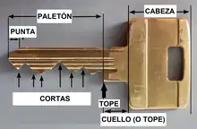 El pestillo de la cerradura es una especie de cerrojo movido por una llave. La cabeza del pestillo es la parte que sale de la cerradura. El pestillo lleva por un lado unas partes salientes o barbas sobre las cuales obra la llave, por otro hay unas muescas sobre las cuales cae el fiador del muelle, parte indispensable para retener el pestillo en su sitio e impedir que corra sin la acción de la llave la cual al mismo tiempo que empuja el pestillo por una de las barbas, levanta el muelle y saca el fiador de su sitio. El pestillo es simple o de rastrillo según esté formado de un solo trozo o tenga varios dientes. En el interior de la cerradura hay ciertas piezas contorneadas que encajan en unos recortes de la llave llamados guardas. Estas sirven para oponerse al movimiento de toda llave que no tenga las muescas proporcionadas. La llave se compone del anillo en que se aplica la nano, del tronco horadado con botón y del paletón. El paletón consta del morro, parte plana y corva que toca al pestillo de la cerradura y de cuerpo que es la parte comprendida entre el morro y el tronco. El paletón tiene diferentes muescas para dar paso a las guardas de la cerradura las cuales reciben diferentes nombres según sus posiciones como el tornillo, la bocina, la cruz cumplida, la de Caravaca, la muleta, el báculo, etc. El tronco no siempre tiene un agujero cilíndrico algunas veces es de forma de trébol, de hierro de lanza, etc. Todos estos orificios se corresponden con la espiga de la cerradura fijada con solidez al palastro.[1]