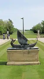 El parque cuenta con un eje central ancho bordeado de arboledas, dos terrazas, estatua y plano de agua.[5]