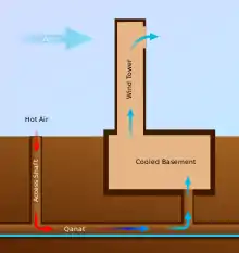 Un chabestán puede enfriarse usando un viaje de agua en conjunto con un captador de viento. El captador de viento es una estructura similar a una chimenea que se coloca sobre las casas; tiene cuatro aberturas, de las cuales la opuesta a la dirección del viento se abre para sacar el aire de la casa. El aire que entra es extraído de un viaje de agua bajo la casa. El flujo de aire a través de la abertura en el eje vertical crea una presión más baja (véase efecto Bernoulli) y hala aire frío desde el túnel del viaje de agua debajo de la casa. El aire del viaje de agua es introducido en el túnel a cierta distancia y se enfría por el contacto con las paredes frías del túnel o con el agua fría, así como por la liberación del calor latente de la evaporación a medida que el agua se evapora en la corriente de aire. En climas desérticos secos, esto puede resultar en una reducción de más de 15 °C de la temperatura del aire procedente del viaje de agua. Los captadores de viento y el enfriamiento por viaje de agua han sido utilizado en climas desérticos durante más de 1000 años.[2]