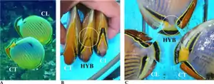 Su parecido con la especie C. lunulatus es enorme. Se trata de especies casi idénticas en apariencia, diferenciándose en que C. trifasciatus tiene la parte anterior de la aleta caudal amarilla-naranja y C. lunulatus tiene esa parte blanca-azulada; y también en que las bandas negras que atraviesan los ojos, en el caso de C. trifasciatus no se llegan a unir en la parte superior de la cabeza, mientras que en C. lunulatus si lo hacen. Por otro lado, en áreas donde los rangos de distribución se unen, como en isla Navidad, se producen hibridaciones entre las dos especies, resultando individuos cuyas diferencias reseñadas anteriormente se difuminan.