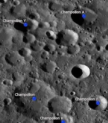 Por convención estos elementos son identificados en los mapas lunares poniendo la letra en el lado del punto medio del cráter que está más cerca de Champollion.