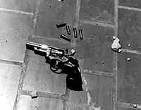 Después de haber vaciado el revólver, Martínez lo tiró al suelo, cogió la escopeta de McCoy, corrió hacia el cuerpo tendido de Whitman y disparó a quemarropa sobre su antebrazo izquierdo. Luego tiró el arma al suelo y rápidamente abandonó la escena gritando: I got him! (¡Le he dado!).