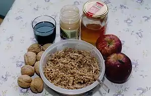 - Una receta típica del Este de Europa (o de tradición Ashkenazi) podría incluir nueces, manzanas, canela, y vino dulce — ingredientes mencionados por el Rey Salomón en el Cantar de los Cantares como resumen de los atributos de los pueblos judíos. La miel o azúcar puede ser empleada tanto como un edulcorante como un ligante de la pasta: la mezcla no es cocinada.