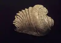 Trompeta Incisa de Strombus, 400-200 a. C., Museo de Brooklyn. Esta trompeta de concha probablemente fue hecha para uso ceremonial. Los diseños incisos representan a una persona de alto rango, indicado por sus tatuajes faciales y adornos en el tobillo, tocando una trompeta de concha. La figura está rodeada de serpientes, incluida una que emana del instrumento. Las serpientes retorcidas y entrelazadas pueden indicar el poder de la trompeta para comunicarse con seres sobrenaturales.