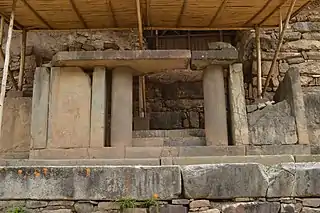 Columnas, losa voladiza y jambas líticas a ambos lados.