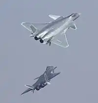 El Chengdu J-20 (en chino tradicional, 殲二十; en chino simplificado, 歼二十; pinyin, Jiān èr shí; literalmente, ‘Interceptor Multipropósito 20’) es un avión de quinta generación de la República Popular China, con tecnología Stealth, desarrollado y producido por la fábrica Chengdu Aircraft Industry Corporation para la Fuerza Aérea del Ejército Popular de Liberación (PLAAF) como una propuesta de caza de tecnología avanzada frente a sus contrapartes occidentales.[10][11] El J-20 está diseñado como un caza de superioridad aérea con capacidad de ataque a tierra, siendo el tercer avión furtivo de quinta generación operativo del mundo después del F-22 y F-35.[12]