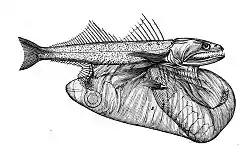 ![]() Chiasmodon niger, con una presa de mayor tamaño que su propio cuerpo. | ||
