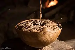 Se tuestan los granos en un comal de barro, se pelan y se ponen a remojar en agua fría para posteriormente escurrirlos y molerlos hasta obtener una pasta homogénea que se disolverá en agua, se le agregará canela y endulzante piloncillo. Se toma bien frío, con hielo.