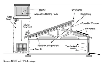 La succión creada en la base de la chimenea se puede utilizar para ventilar y para refrescar el edificio.
