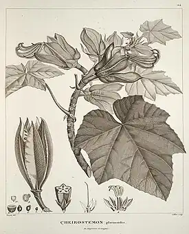 ![]() Ilustración de Chiranthodendron pentadactylon (bajo el sinónimo Cheirostemon platanoides), por Alexander von Humboldt. | ||