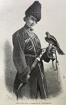 - En el original, el dibujo se llama «Bek-Tatar de Karabaj» (en francés: Beck Tatare du Karabakhe). Se sabe que en el siglo XIX los viajeros rusos también llamaban tártaros a los azeríes.