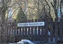 - En Oslo, la carretera Christopher Hansteens vei en Blindern también rinde homenaje a Hansteen. Así mismo, una calle en Majorstuen llevaba el nombre de Hansteens gate, pero en 1879 fue rebautizada Holmboes gate en honor de Bernt Michael Holmboe.[7] En el barrio de Møhlenpris en Bergen, la calle del Profesor Hansteens gate recibió este nombre en 1881.[8]