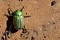 Los adultos miden de 25 a 28 milímetros (0,98 a 1,10 pulgadas) de largo y son de color verde brillante con rayas plateadas en los élitros. Las diferencias de color son el resultado de la estructura microscópica de cada sección, con el verde reflejado en estructuras con forma de cúspide y el plateado reflejado en capas planas paralelas a la superficie de los élitros.[3]