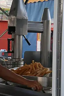 - una churrera manual o automática para dar forma y crear el churro (denominada a veces como churrera de hombro). Se trata de una aparato en el que se introduce la masa por un extremo, extrayéndose el churro por el otro por la aplicación de presión.