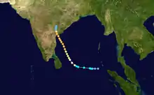 A medida que el ciclón se acercaba a la costa india, aceleró a 17 km/h (10 mph) mientras se debilitaba ligeramente desde su intensidad máxima. La tormenta tocó tierra cerca de Chirala, en el distrito de Prakasam en el centro de Andhra Pradesh, alrededor de las 11:00 UTC del 19 de noviembre con vientos sostenidos de un minuto de 195 km/h (120 mph). Moviéndose hacia el norte sobre tierras agrícolas planas, la tormenta se debilitó y el JTWC emitió su advertencia final a las 20:00 UTC de esa noche.[2] El IMD continuó rastreando el sistema, informando que se debilitó en un área de baja presión en la noche del 20 de noviembre antes de disiparse en el sureste de Madhya Pradesh y Odisha la noche siguiente.[4]