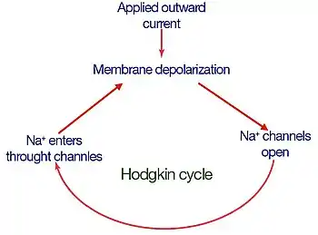 El ciclo de Hodgkin representa un ciclo de retroalimentación positiva en el que una despolarización inicial de la membrana conduce a una desviación incontrolada del potencial de membrana hasta cerca del VNa. La despolarización inicial debe alcanzar o superar un cierto umbral para activar los canales de Na+ activados por voltaje. La apertura de los canales de Na+ permite la entrada de Na+, que, a su vez, despolariza aún más la membrana. La despolarización adicional activa canales de Na+ adicionales. Este ciclo conduce a un aumento muy rápido de la conductancia de Na+ (gNa), que mueve el potencial de membrana cerca del VNa. El ciclo se rompe cuando el potencial de membrana alcanza el potencial de equilibrio de sodio y los canales de potasio se abren para repolarizar el potencial de membrana. Este circuito de retroalimentación positiva significa que cuanto más cerca estén estos canales de Na+ activados por voltaje, menor será el umbral de activación.[1]