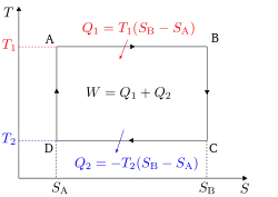 Otra forma de llegar a este resultado es por medio de la entropía, definida como . De ahí se puede sacar los calores transferidos en los procesos 1 → 2 y 3 → 4: