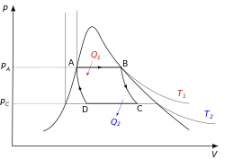 Expansión isoterma (proceso A → B en el diagrama): Se parte de una situación en que el gas se encuentra al mínimo volumen del ciclo y a temperatura T1 de la fuente caliente. En este estado se transfiere calor al cilindro desde la fuente de temperatura T1, haciendo que el gas se expanda. Al expandirse, el gas tiende a enfriarse, pero absorbe calor de T1 y mantiene su temperatura constante. Al tratarse de un gas ideal, al no cambiar la temperatura tampoco lo hace su energía interna, y despreciando los cambios en la energía potencial y la cinética, a partir de la 1.ª ley de la termodinámica se observa que todo el calor transferido es convertido en trabajo: