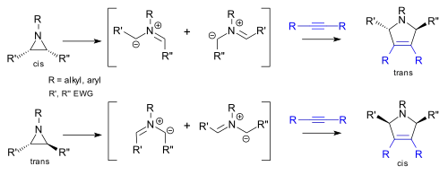 Ciertas aziridinas N-sustituidas con grupos aceptores de electrones en ambos carbonos, forman iluros de azometina en una reacción de apertura de anillo térmica o fotoquímica.[11][12] Estos iluros pueden reaccionar con un dipolarófilo adecuado en una cicloadición 1,3-dipolar:[13]