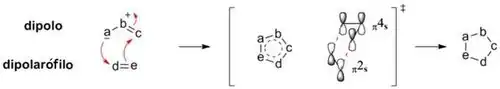 Originalmente había dos propuestas que describen el mecanismo de la cicloadición 1,3-dipolar: en primer lugar, el mecanismo de cicloadición pericíclica concertada, propuesto por Rolf Huisgen;[4] y en segundo lugar, un mecanismo por etapas con un intermedio biradical, propuesto por Firestone[5] Después de mucho debate, la propuesta que es ahora generalmente aceptada[6] consiste en una reacción concertada entre el 1,3-dipolo y el dipolarófilo, a menudo de forma asíncrona, y la simetría permitida es π4s + π2s térmica de 6 electrones a través de un estado de transición aromático. Aunque también existen muchos ejemplos de reacciones de cicloadición 1,3-dipolar por pasos.[7][8]