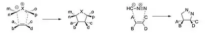 La cicloadición 1,3-dipolar es una reacción de cicloadición en química orgánica. En esta reacción participa una molécula con un fragmento 1,3-dipolar (es decir, un fragmento que forme un dipolo eléctrico a nivel molecular por deslocalización electrónica a lo largo de 3 átomos).[1] Como ejemplos de 1,3-dipolos están el ozono, las azidas, los diazoalcanos, los nitrilos, las nitronas, etc. que se unen a alquenos o alquinos (que serían los dipolarófilos) por cicloadición 1,3-dipolar.[2] La economía atómica de las reacciones de cicloadición 1,3-dipolar es excelente. La cicloadición 1,3-dipolar se esquematiza a continuación: