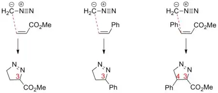 En el ejemplo, se considera la cicloadición de diazometano a tres dipolarófilos: acrilato de metilo, estireno o cinamato de metilo. El carbono del diazometano tiene el orbital HOMO más grande, mientras que los carbonos olefínicos terminales de acrilato de metilo y estireno tienen el mayor LUMO. Así, la cicloadición da la sustitución en la posición C-3 regioselectiva (en la figura los números en rojo son los localizadores del anillo de pirazolina). Para el cinamato de metilo, los dos sustituyentes (Ph vs COOMe) compiten en la retirada de electrones al alqueno. El carboxilo es el mejor grupo de retirada de electrones, causando que el β-carbono sea el más electrofílico. Por lo tanto, cicloadición se obtiene el grupo carboxilo en C-3 y el grupo fenilo en C-4 regioselectiva.