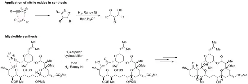 La cicloadición 1,3-dipolar con óxidos de nitrilo es una reacción aldólica enmascarada ampliamente utilizada. La cicloadición entre un óxido de nitrilo y un alqueno da como producto un derivado de isoxazolina, mientras que la reacción con un alquino produce el isoxazol. Ambos productos, isoxazolinas e isoxazoles, pueden ser escindidos por hidrogenación del enlace N-O para revelar la reacción aldólica de tipo β-hidroxicarbonilo o productos β-dicarbonilo de tipo Claisen, respectivamente. La cicloadición del óxido de nitrilo con un alquino, seguido de hidrogenación, se utiliza en la síntesis de Miyakolide como se ilustra en la figura siguiente:[15]