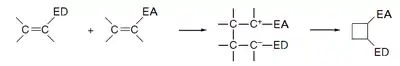 La cicloadición [2+2] puede llevarse a cabo de manera no concertada a través de un intermedio zwitteriónico al hacer reaccionar alquenos con grupos ricos en densidad electrónica (enamina, vinil éteres...) con alquenos con grupos electrófilos (nitro, cianoetileno...):