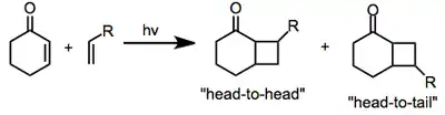 La fotocicloadición [2 +2] puede producir dos isómeros, dependiendo de la orientación de los sustituyentes en el alqueno y el grupo carbonilo de la enona. Cuando el carbonilo de la enona y el sustituyente de mayor prioridad están cerca, el isómero se denomina "cabeza a cabeza" (del inglés "head-to-head". Cuando el carbonilo de la enona y el sustituyente están lejos, el isómero se denomina "cabeza-a-cola" (del inglés "head-to-tail". La selectividad para uno de estos isómeros depende tanto de factores estéricos como electrónicos (ver más abajo).