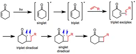 El mecanismo de fotocicloadición [2 +2] se propone que empiece por la fotoexcitación de la enona a un estado excitado singlete. El estado singlete suele ser de muy corta duración, y decae a un estado triplete. En este punto, la enona forma un excímero con el alqueno en estado fundamental, con el tiempo dando un birradical triplete. Cuando cambia la inversión a singlete birradical permite el cierre del ciclobutano.[8] Como alternativa se propone un mecanismo de reacción pericíclica, en el que después de decaer al estado triplete, se forman un catión radical y un anión radical, que luego se recombinan para dar el ciclobutano.[9]