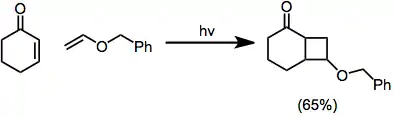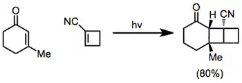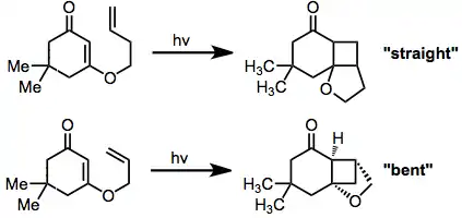 Las cicloadiciones [2 +2] intramoleculares pueden dar tanto productos "doblados" (del inglés "bent") como productos "derechos" (del inglés "straight")en función de la regioselectividad de la reacción. Cuando el fragmento conector entre la enona y el alqueno es de dos átomos de largo, los productos "doblados" predominan debido a la rápida formación de los anillos de cinco miembros.[11] Fragmentos conectores más largos tienden a dar productos "derechos".[12]
