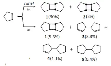 Es bien conocido el uso de sales de cobre (I), sobre todo del triflato de cobre (I) (CuOTf), como catalizador (o fotosensibilizador) en las cicloadiciones [2+2]. Se ha descrito el uso de estas sales para la fotodimerización de diferentes alquenos, entre ellos el ciclopenteno:[5]
