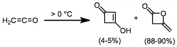 La cetenas pueden dimerizar, o dos cetenas pueden reaccionar una con la otra para proporcionar ciclobutanonas sustituidas. En general, existen dos productos posibles en función de los dobles enlaces precisos que reaccionan:[18]