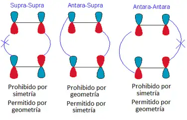 Una cicloadición [2 +2] es un proceso de 4 electrones que sigue las reglas de Woodward-Hoffmann. Estas reglas nos dicen que la aproximación suprafacial-suprafacial está prohibida por simetría en condiciones térmicas, pero permitida en condiciones fotoquímicas; la aproximación suprafacial-antarafacial está permitida por simetría, pero prohibida por la geometría; y la aproximación antarafacial-antarafacial está prohibida por la simetría en condiciones térmicas, pero permitida en condiciones fotoquímicas: