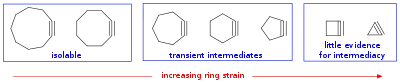 Debido a las importantes restricciones geométricas impuestas por la funcionalidad R–C≡C–R, los cicloalquinos más pequeños que el ciclodecino (C10H16) dan como resultado estructuras altamente deformadas. Mientras que el ciclononino (C9H14) y el ciclooctino (C8H12) son compuestos aislables (aunque fuertemente reactivos), el cicloheptino (C7H10), ciclohexino (C6H8) y ciclopentino (C5H6) solo existen como intermedios de reacción transitorios o como ligandos que se coordinan con un centro metálico.[3] Hay poca evidencia experimental que respalde la existencia de ciclobutino (C4H4) o ciclopropino (C3H2), además de estudios que informan el aislamiento de un complejo de osmio con ligandos de ciclobutino.[4] Los estudios iniciales que demostraron la intermediación transitoria de los cicloalquinos de siete, seis y cinco carbonos se basaron en atrapar el alquino de alta energía con un compañero de reacción adecuado, como dienos cíclicos o compuestos diazo para generar productos de Diels-Alder o diazoalcano de cicloadición 1,3-dipolar, respectivamente.[5] Los cicloalquinos estables de anillos pequeños se han aislado posteriormente en complejos con varios metales de transición como el níquel, el paladio y el platino .[6] A pesar de que durante mucho tiempo se consideraron curiosidades químicas con aplicaciones sintéticas limitadas, trabajos recientes han demostrado la utilidad de los cicloalquinos tensos tanto en la síntesis total de productos naturales complejos como en la química bioortogonal .[7][8]
