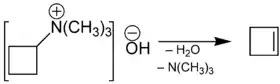 Por destilación seca del hidróxido de ciclobutiltrimetilamonio, se obtiene ciclobuteno por la reacción llamada eliminación de Hofmann.[3]