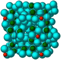 ![]() Estructura cristalina del ZS-9. Esferas azules = átomos de oxígeno, esferas rojas = átomos de circonio, esferas verdes = átomos de silicio. | ||