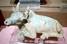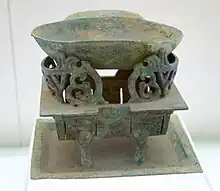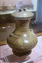 La alfarería gris de la dinastía Han, con su color característico procedente de la arcilla empleada, era superior a la cerámica gris china anterior debido al uso por parte del pueblo Han de cámaras kiln más grandes, túneles de cocción más largos y diseños de chimenea mejorados.[15] Los hornos de la dinastía Han que fabricaban cerámica gris podían alcanzar temperaturas de cocción superiores a los 1000 °C.[15] Sin embargo, la cerámica dura del sur de China hecha con una arcilla adhesiva densa que solo se encuentra en el sur de China (es decir, en la provincia de Cantón, Guangxi, Hunan, Jiangxi, Fujian, Zhejiang y Jiangsu del sur) se cocía a temperaturas aún más altas que la cerámica gris durante el período Han.[15] La cerámica vidriada de las dinastías Shang (c. 1600 – c. 1050 a. C.) y Zhou (c. 1050 – 256 a. C.) también se cocían a temperaturas muy altas, pero a mediados del período Han Occidental (206 a. C. – 9 d. C.), se produjo una cerámica vidriada marrón cocida a baja temperatura (de unos 800 °C), seguida de una cerámica vidriada verde que se hizo popular en el período Han del Este (25-220 d. C.).[16]