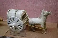 La arqueología moderna ha llevado al descubrimiento de obras de arte Han que representan invenciones que de otro modo estarían ausentes en las fuentes literarias de la época, como por ejemplo la manivela. Los modelos de cerámica encontrados en sepulturas de la época Han de granjas y molinos de grano incluyen las primeras representaciones conocidas de manivelas, que se usaron para accionar los ventiladores de las máquinas de aventar.[59] La máquina se usaba para separar la paja del grano, pero los chinos de dinastías posteriores también emplearon la manivela para enrollar seda, hilar cáñamo, tamizar harina y sacar agua de un pozo usando un molinete.[59] Para medir la distancia recorrida, los chinos de la era Han también crearon el odómetro. Esta invención está representada en obras de arte Han del siglo II d. C., pero no se ofrecieron descripciones escritas detalladas hasta el siglo III.[60] Las ruedas de este dispositivo hacían girar un conjunto de engranajes que a su vez obligaban a figuras mecánicas a golpear gongs y tambores que avisaban a los viajeros de la distancia recorrida (medida en li).[61] A partir de ejemplos encontrados en excavaciones arqueológicas, se sabe que los artesanos de la era Han utilizaban calibres metálicos para realizar mediciones precisas. Aunque los calibres de la era Han tienen inscripciones incisas del día exacto del año en que se fabricaron, no se mencionan en ninguna fuente literaria Han.[62]